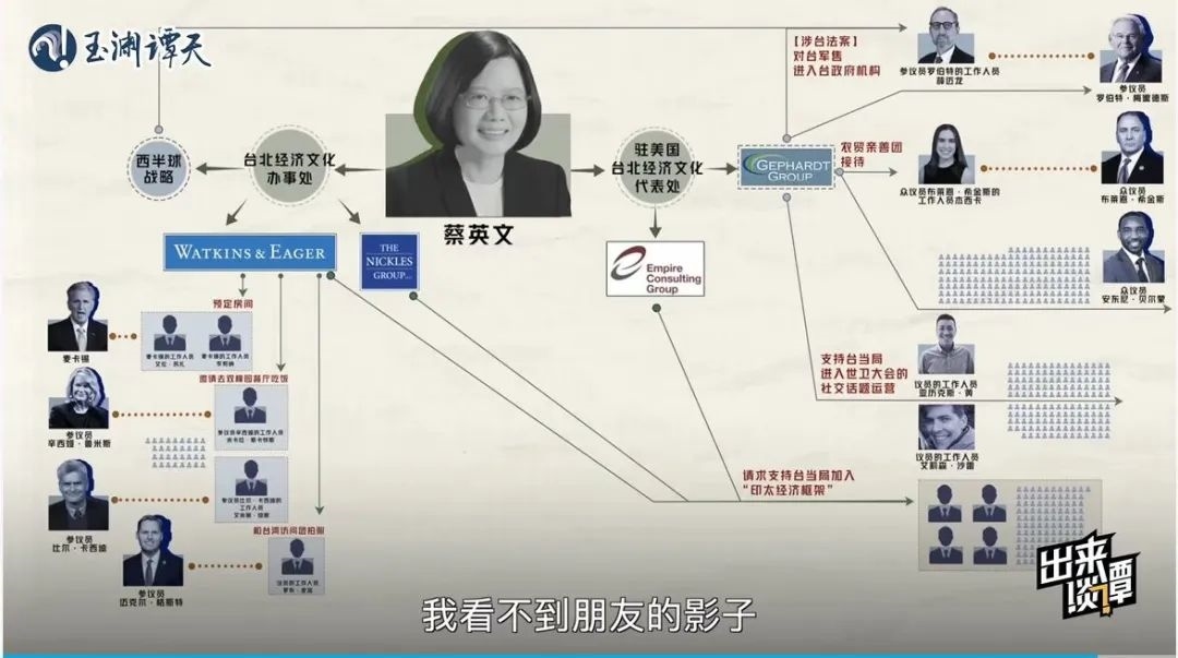 趁熱再打鐵,玉淵譚天繼續(xù)抽絲剝繭,以數(shù)據(jù)視頻《起底!臺(tái)當(dāng)局“朋友圈”大公開(kāi)》深扒臺(tái)當(dāng)局近兩年在美國(guó)登記在冊(cè)的游說(shuō)方式與對(duì)象,用翔實(shí)的數(shù)據(jù),揭秘了臺(tái)當(dāng)局能接觸到的美國(guó)會(huì)人員多為邊緣人的真相,結(jié)合送“保護(hù)費(fèi)”、送“官職”等賣(mài)臺(tái)行為實(shí)錘,讓臺(tái)當(dāng)局在所謂“美臺(tái)關(guān)系”中的卑微姿態(tài)展露無(wú)遺。