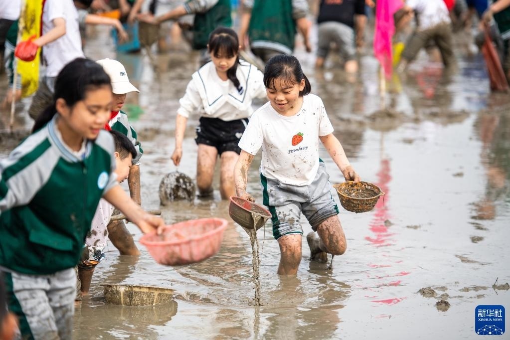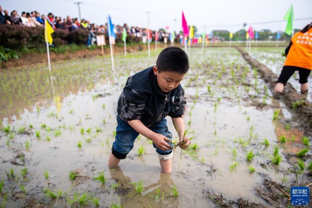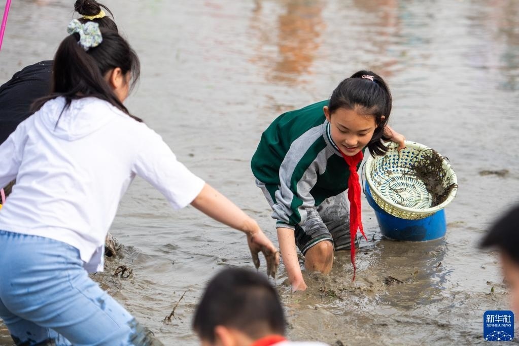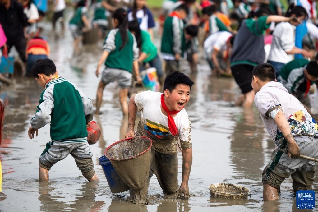 當(dāng)日,在湖南省長沙市寧鄉(xiāng)市灰湯鎮(zhèn)花果山村舉行的農(nóng)耕民俗文化節(jié)學(xué)生研學(xué)活動中,孩子們通過開展稻田插秧、捉泥鰍等“農(nóng)趣” 比賽,走進田間地頭,感受勞動帶來的艱辛與快樂。新華社記者 陳思汗 攝
