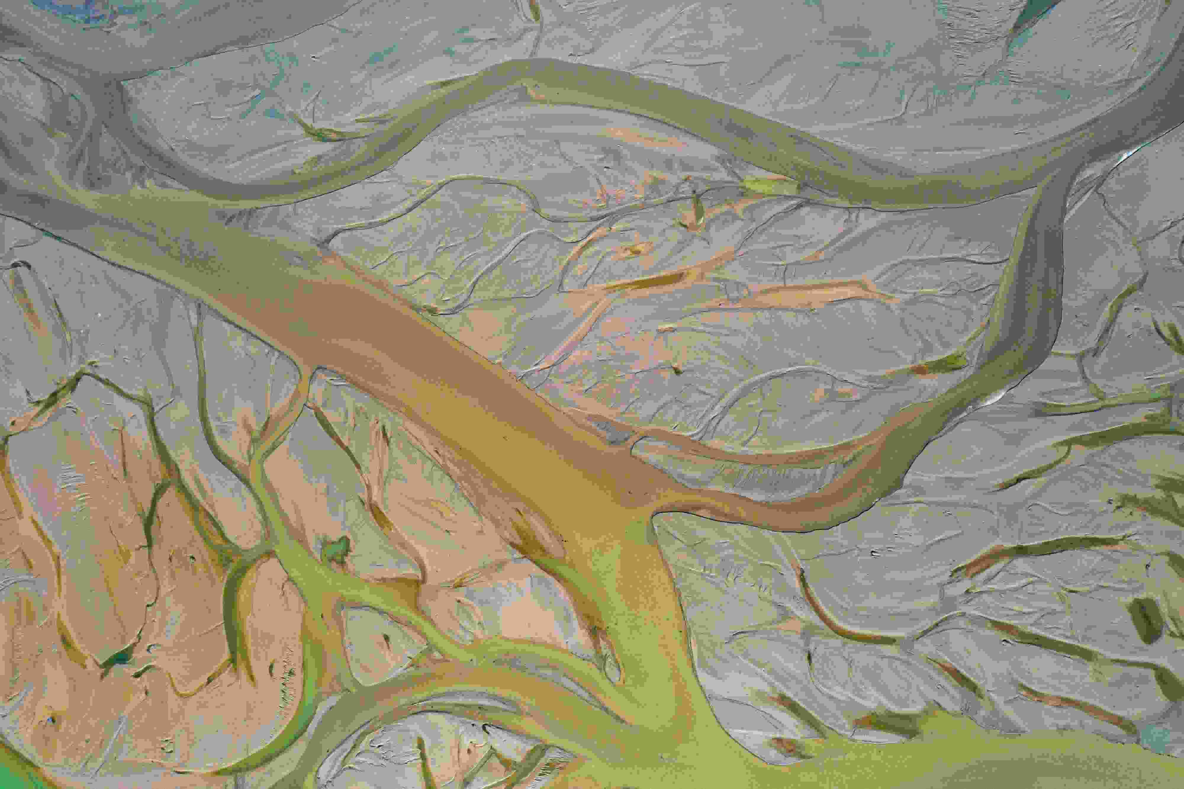 4月16日,山西運(yùn)城,由于黃河上游降雨和庫(kù)區(qū)泄水水量增加,黃河永濟(jì)段河床在水流沖刷下河汊縱橫,高空俯瞰宛若“大地血脈”。 視覺(jué)中國(guó)