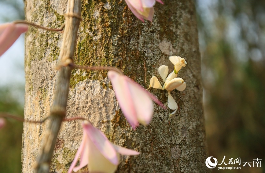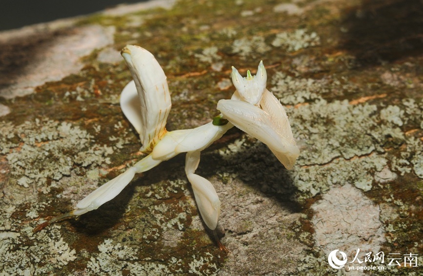 寧洱縣同心鎮(zhèn)林業(yè)和草原服務(wù)中心主任楊夢(mèng)醒介紹,經(jīng)鑒定,這只白色的蟲子是昆蟲綱花螳科的一種動(dòng)物,名為蘭花螳螂,是螳螂目中最為漂亮的一種,比較稀有?!拔覀兺ㄟ^(guò)查閱資料發(fā)現(xiàn),蘭花螳螂在寧洱縣并無(wú)記錄,這次是首次發(fā)現(xiàn)?!?