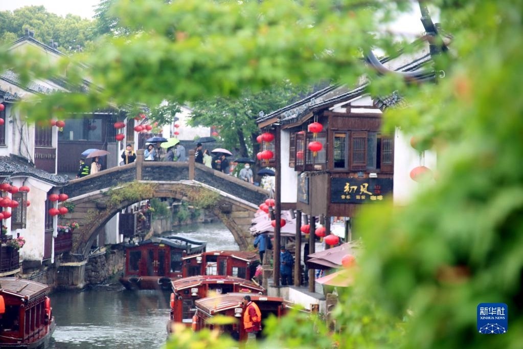 4月29日,游客在江蘇蘇州山塘古街游覽。