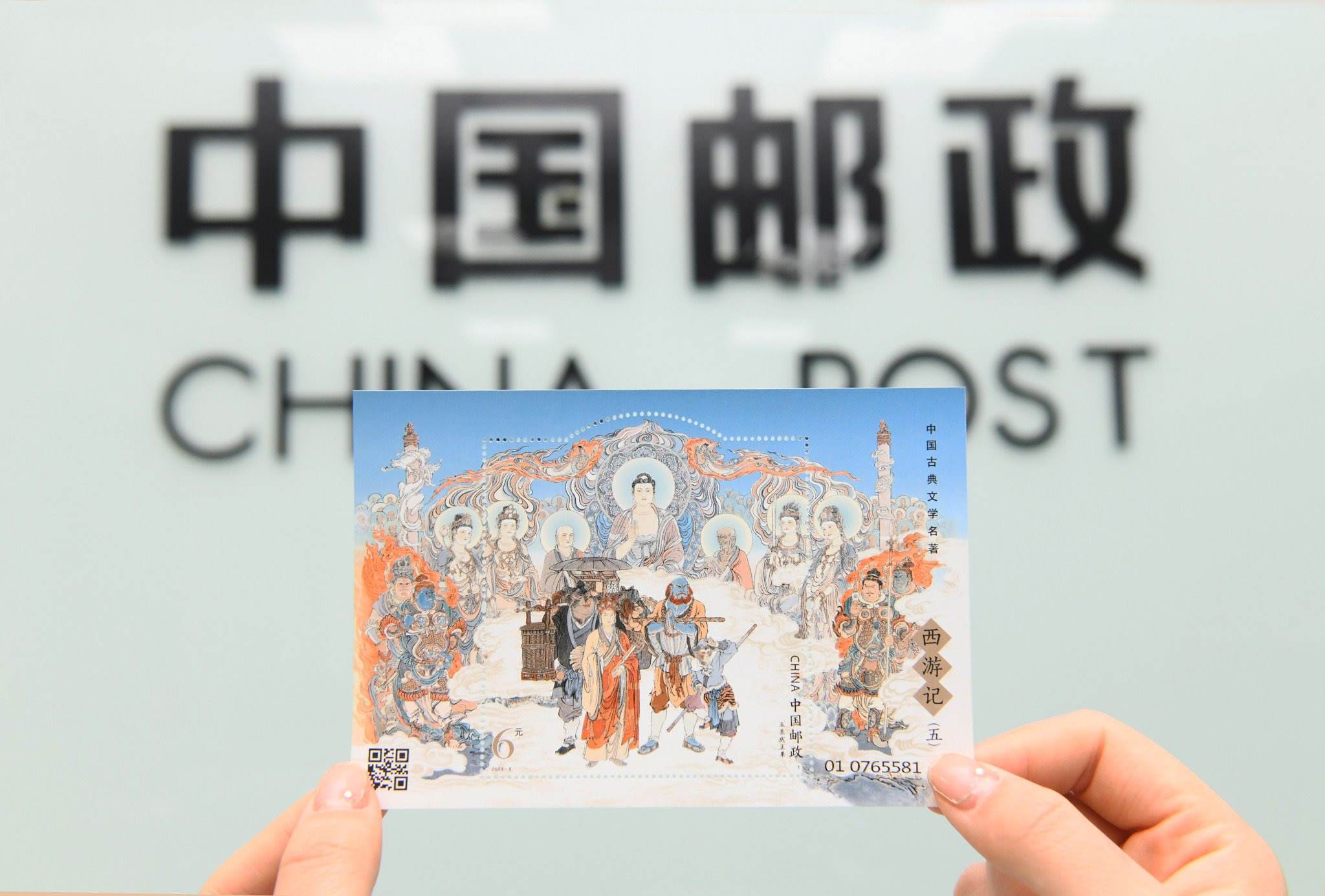 2023年4月27日,中國郵政集團公司河北省新樂市分公司,工作人員展示發(fā)行的《中國古典文學名著—<西游記>(五)》特種郵票。視覺中國