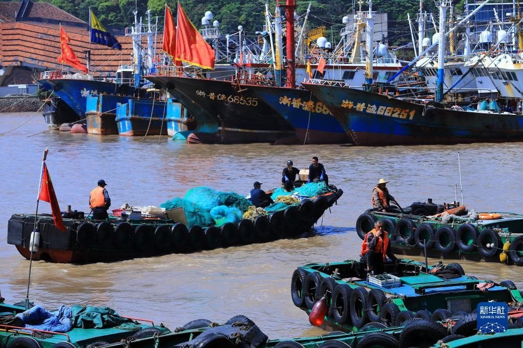 4月30日,浙江省舟山市普陀區(qū)沈家門漁港內(nèi)的小船將網(wǎng)具和漁民從漁船上送回岸邊。
