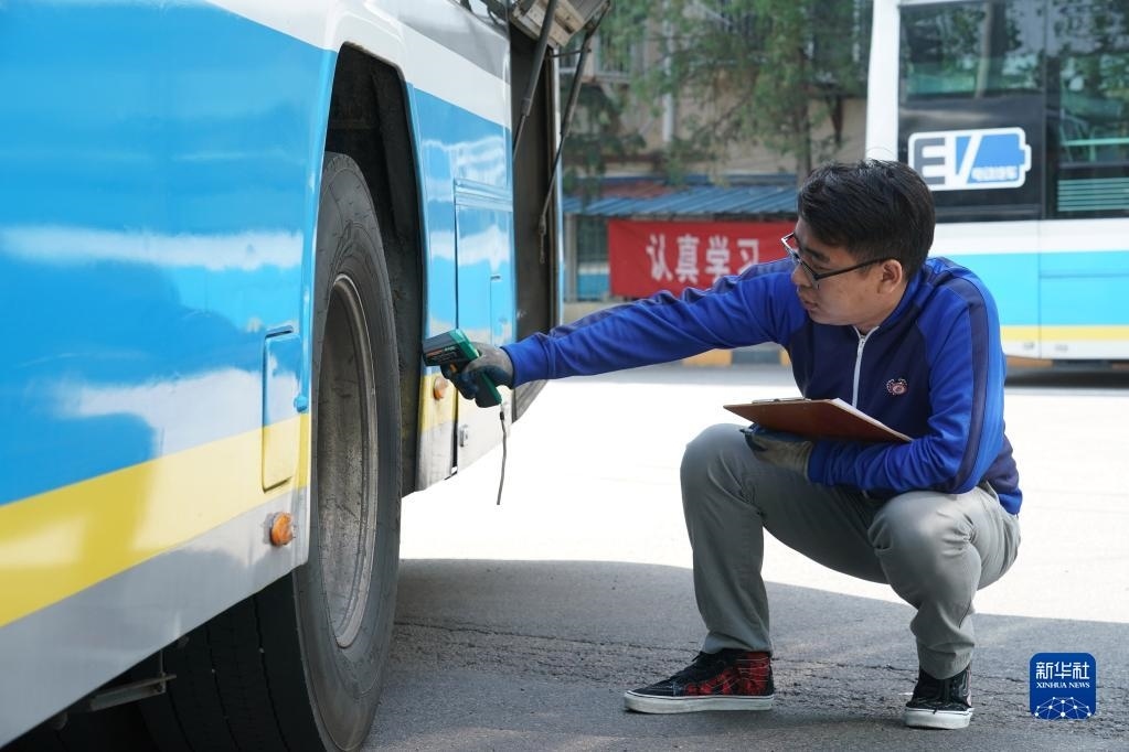 5月1日,在位于北京市朝陽區(qū)的柳芳公交場站,技術員王陸斌對車輪測溫。