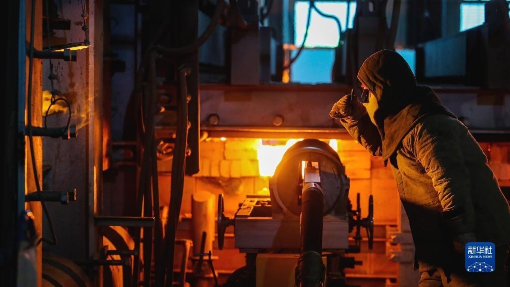 5月1日,在河南省商丘市睢陽區(qū)一家玻璃生產(chǎn)企業(yè),工人在車間觀察玻璃液熔制情況。