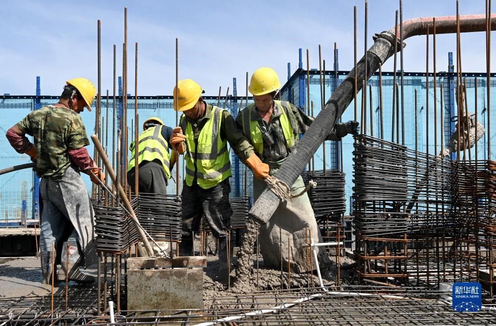 5月1日,在浙江省杭州市臨平區(qū)一個項目工地,中建三局的建設者在施工中。