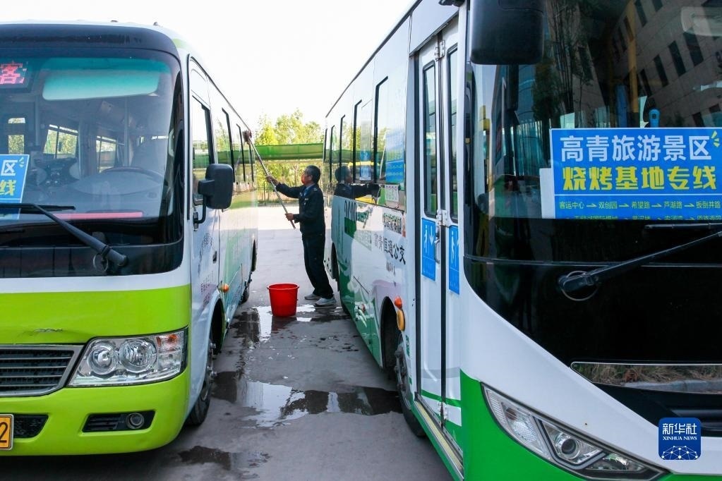 4月29日,在淄博市高青縣客運站,一名司機在保養(yǎng)車輛。當?shù)赝瞥?元“燒烤公交”專線方便游客出行。