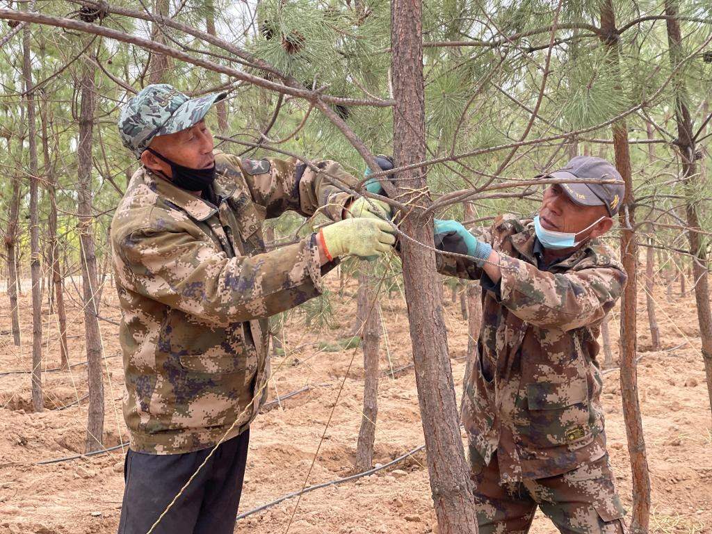 記者看到,為應(yīng)對當?shù)卮杭敬箫L(fēng)天氣,苗木工人在每棵樹四周打下木樁,再用繩子將樹苗與樹樁捆綁,進一步固定苗木,以提高成活率。