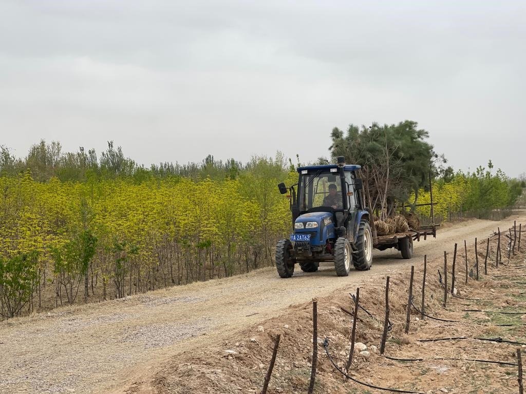 寧夏靈武白芨灘國家級自然保護區(qū)馬鞍山林場內(nèi),一輛拖拉機在運送樹苗。新華社記者蘇醒 攝
