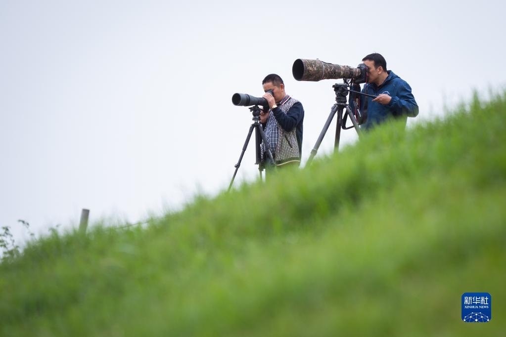 4月29日,在石首麋鹿國家級自然保護(hù)區(qū),工程師張玉銘(右)和巡護(hù)員劉吉高在觀測遠(yuǎn)處的麋鹿群。