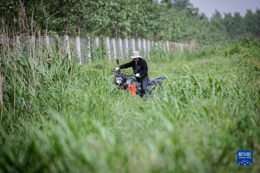 4月29日,在石首麋鹿國家級自然保護(hù)區(qū),巡護(hù)員王傳軍騎車在齊腰高的野草中巡邏。