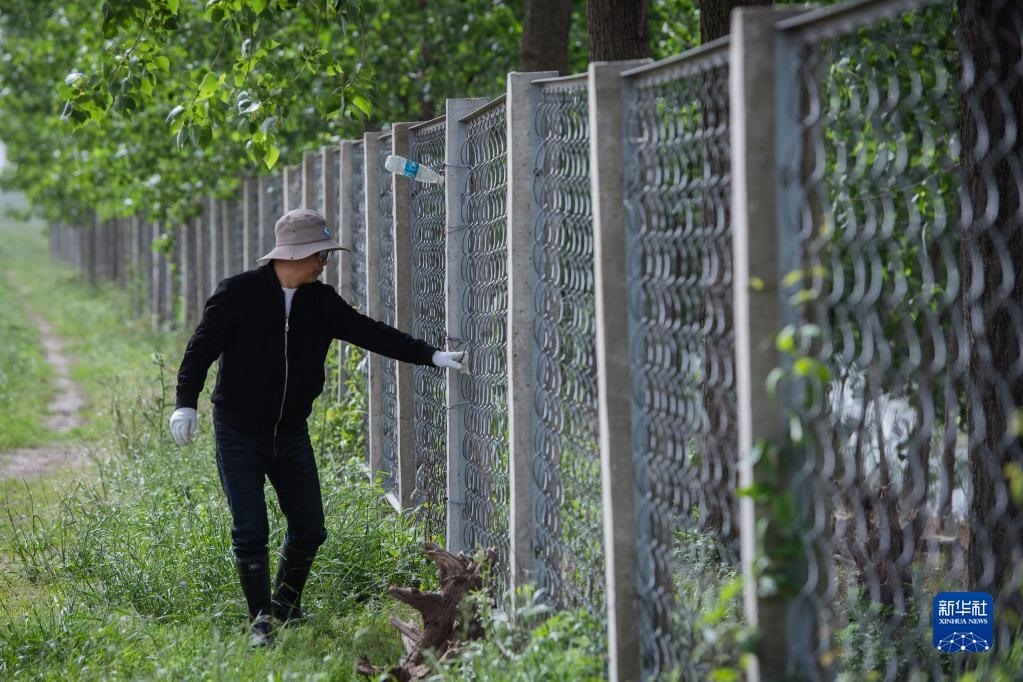 4月29日,巡護(hù)員王傳軍在石首麋鹿國家級自然保護(hù)區(qū)檢查鐵絲網(wǎng)。