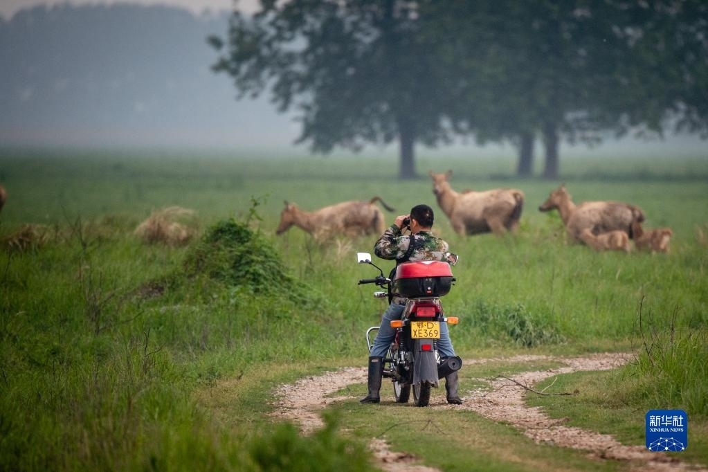 4月28日,在石首麋鹿國家級自然保護(hù)區(qū),巡護(hù)員劉吉高觀測遠(yuǎn)處的一群麋鹿。