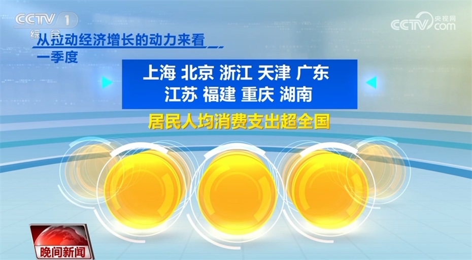 此外,各地經(jīng)濟發(fā)展也呈現(xiàn)回升向好態(tài)勢。目前,全國31個?。▍^(qū)、市),已經(jīng)全部公布一季度的經(jīng)濟運行數(shù)據(jù)。從GDP增速來看,31個?。▍^(qū)、市)中有23個省份跑贏全國一季度GDP平均增速4.5%,從地區(qū)GDP總量看,有12個省份超1萬億,廣東超過了3萬億。從拉動經(jīng)濟增長的動力來看,一季度,上海、北京、浙江、天津、廣東、江蘇、福建、重慶、湖南9省份,居民人均消費支出超全國。