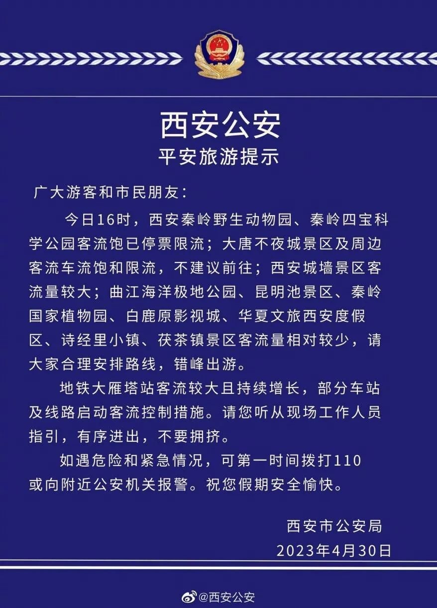4月30日,西安多個景區(qū)停票限流。西安公安果斷發(fā)布旅游提示,不建議游客前往大唐不夜城,提示游客合理安排路線,錯峰出游。