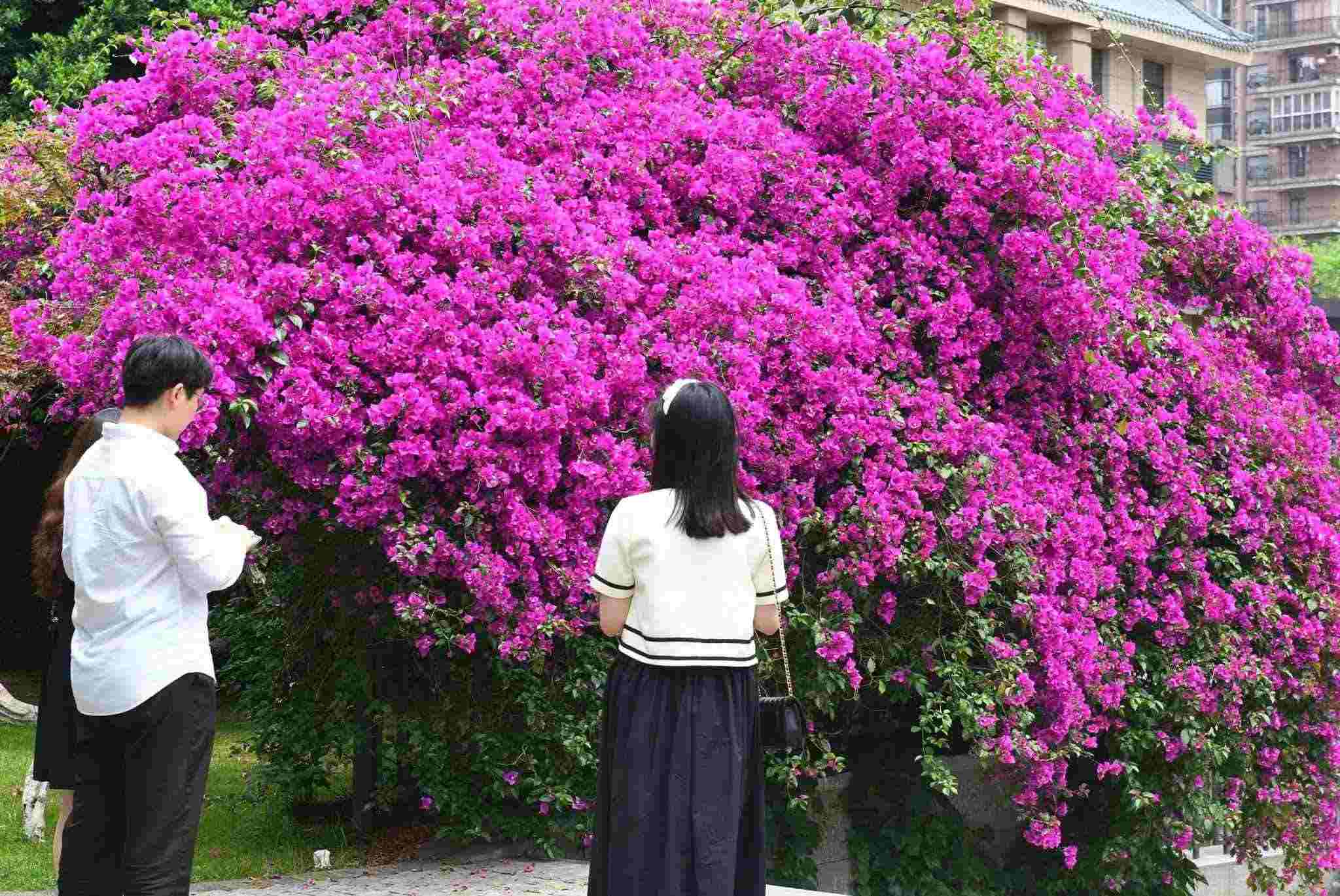 2023年5月5日,重慶,渝中區(qū)上清寺一建筑被盛開的三角梅層層環(huán)繞,仿佛穿上了一件“花衣”。視覺中國