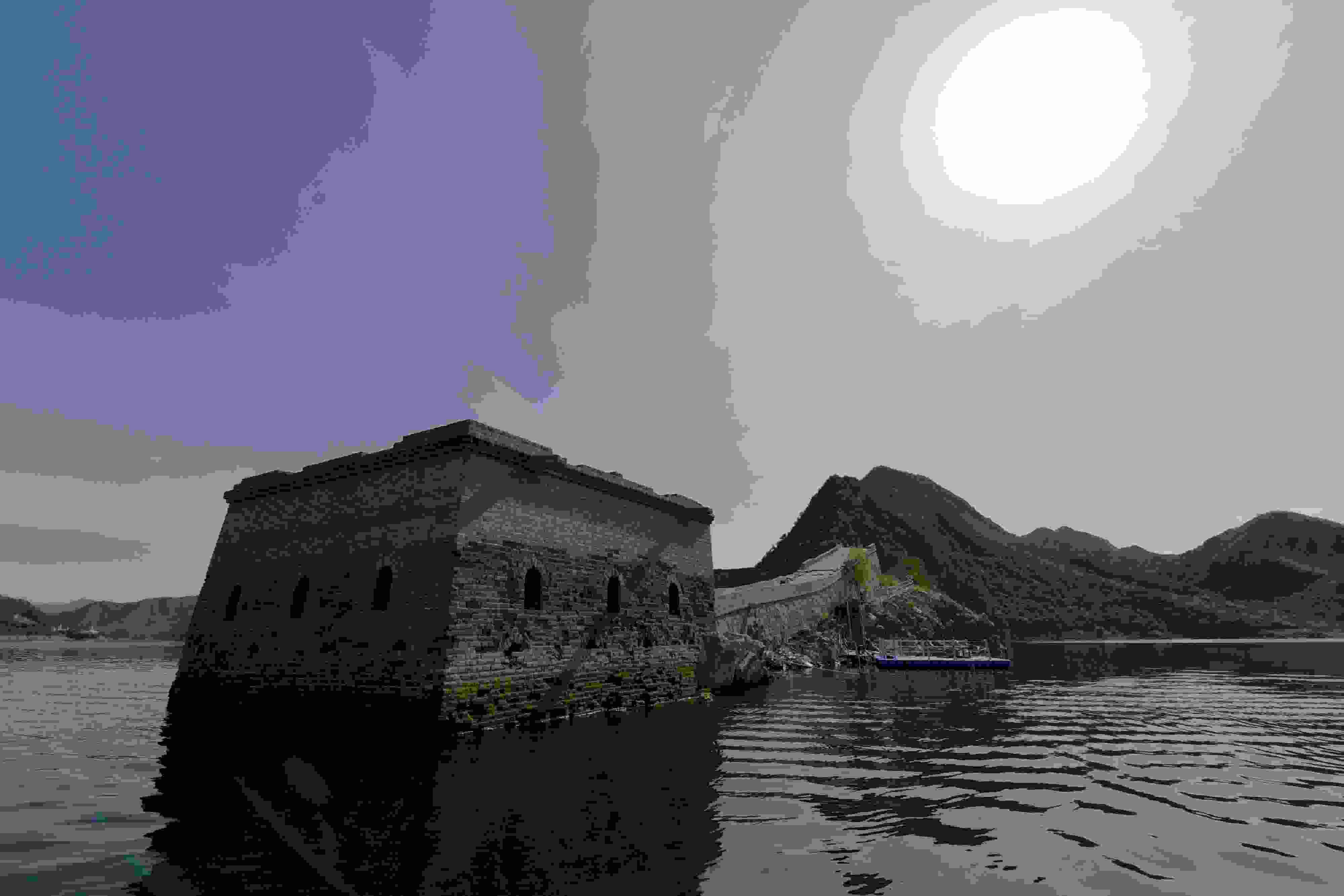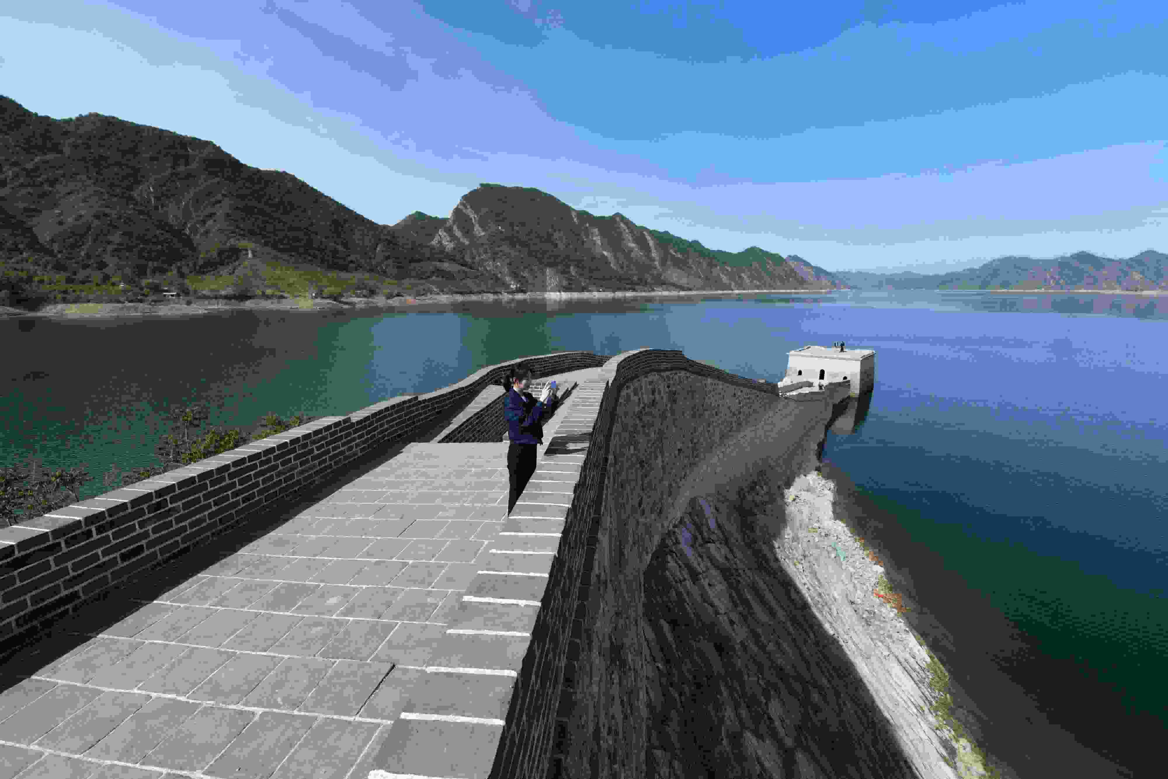 2023年5月8日,河北承德,寬城滿族自治縣境內(nèi)潘家口水庫(kù)的“水下長(zhǎng)城”。這段“水下長(zhǎng)城”是明長(zhǎng)城的遺址,20世紀(jì)70年代因建設(shè)水利樞紐工程,部分長(zhǎng)城隱沒(méi)水下,從而形成“水下長(zhǎng)城”景觀。 視覺(jué)中國(guó)