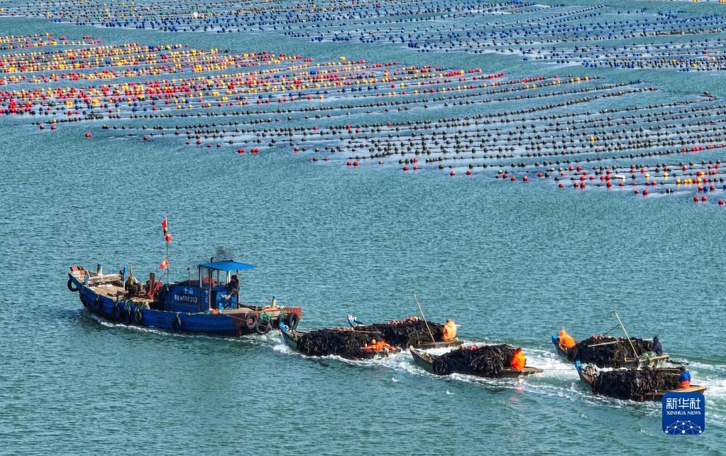 5月8日,在山東省榮成市愛倫灣海域海帶養(yǎng)殖區(qū),漁民采收海帶(無人機(jī)照片)。