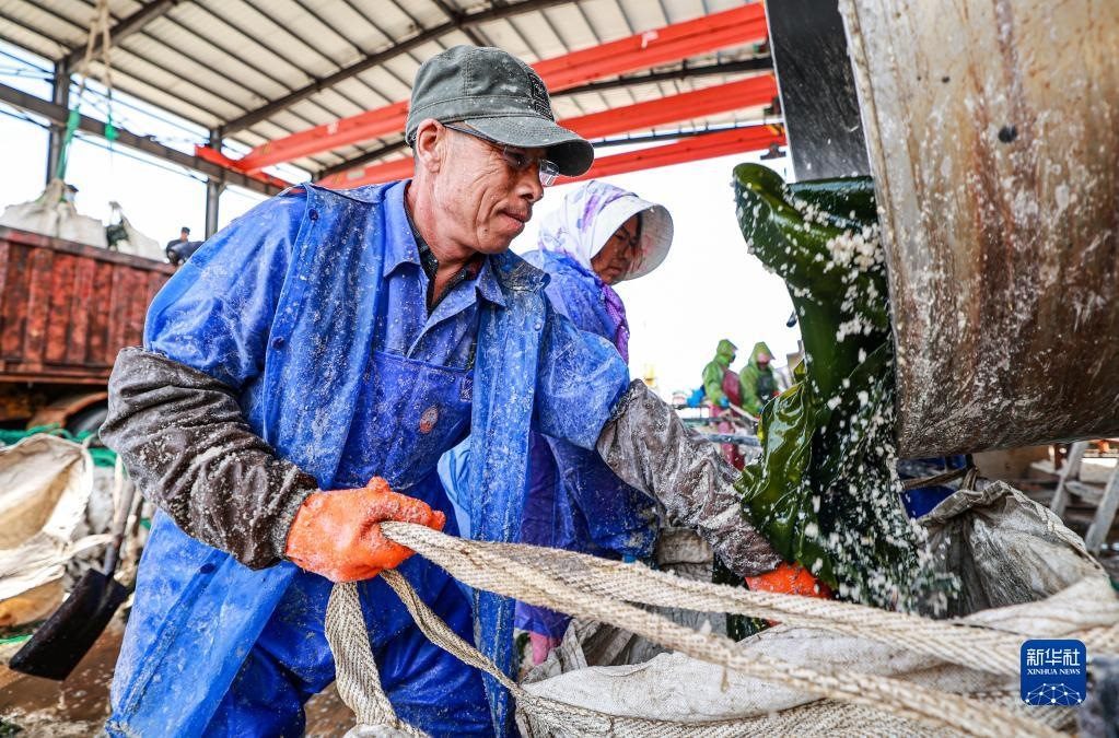 眼下,山東省榮成市正值海帶采收、加工旺季,養(yǎng)殖工將采收的海帶運(yùn)到鹽漬海帶生產(chǎn)車間進(jìn)行加工。