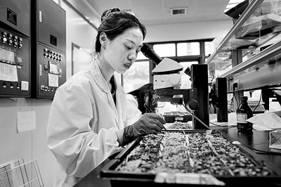 3月29日,在內(nèi)蒙古林業(yè)科學(xué)研究院承擔(dān)的“沙地生物資源保護(hù)與培育國(guó)家林業(yè)和草原局重點(diǎn)實(shí)驗(yàn)室”,科研人員在觀察黑果枸杞組培苗的培養(yǎng)狀態(tài)。丁根厚攝/光明圖片
