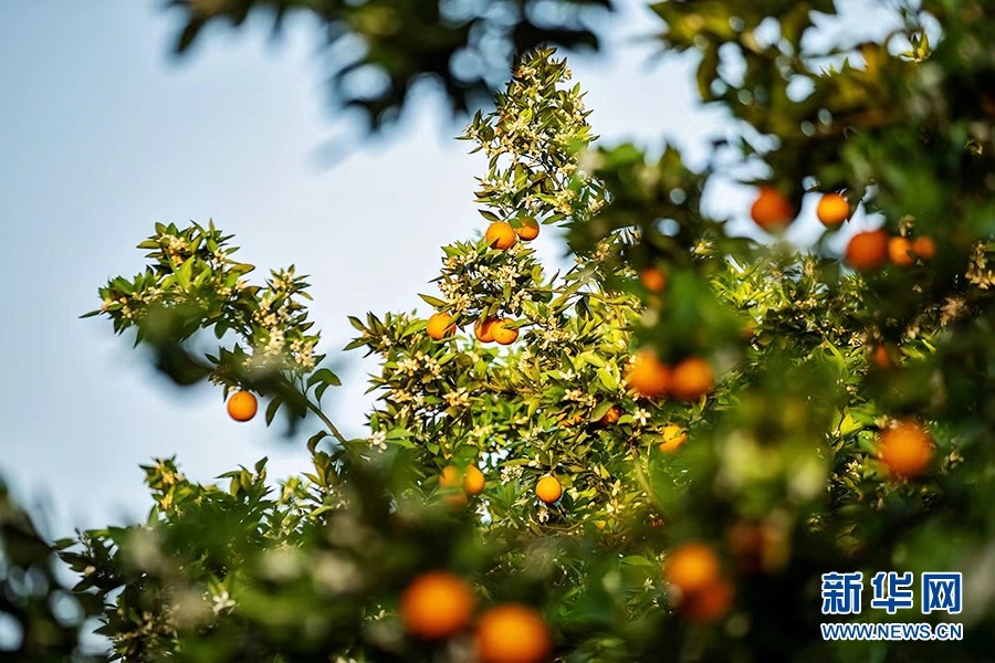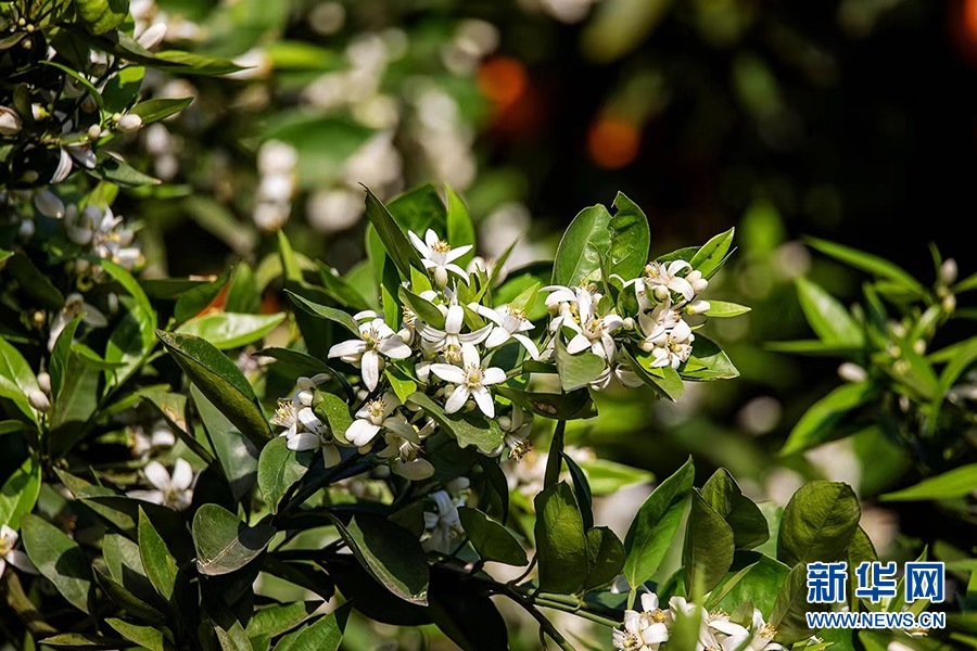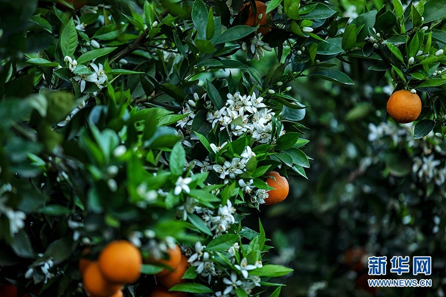 柑橘園里,濃郁的花香隨風四溢,金燦燦的柑橘掩映在枝葉中,星星點點的小白花點綴其間,花香和果香交織沁人心脾。新華網(wǎng)發(fā)(余鴻 攝)