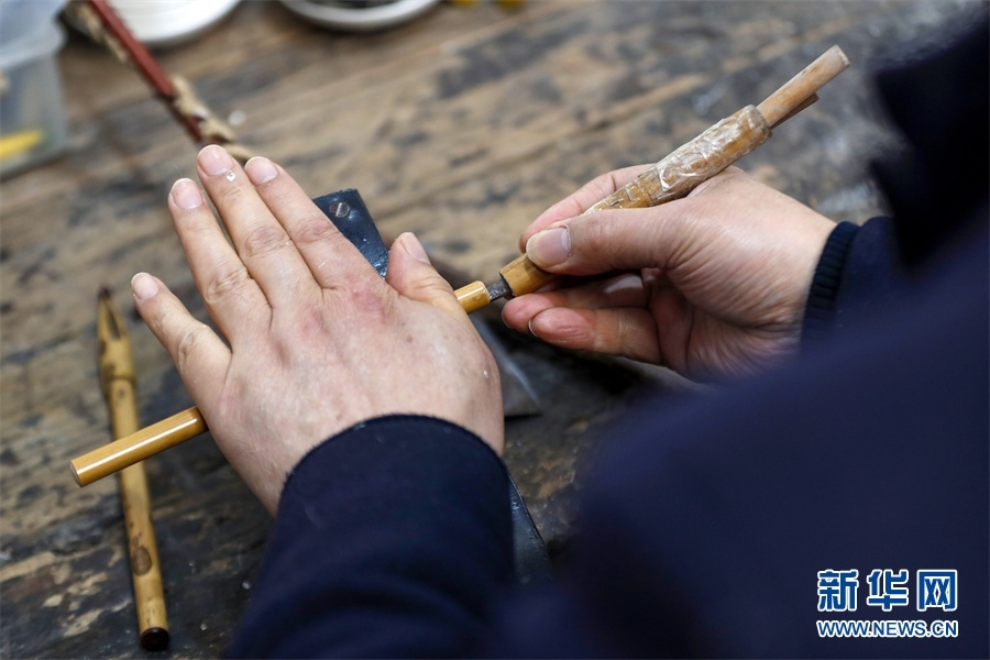 一支好的徽筆,不僅要保留傳統(tǒng)工藝,且要在原基礎上不斷創(chuàng)新、改良。楊文尤其重視書畫家對筆的使用反饋:“因為他們對用筆最挑剔,而且現(xiàn)代書畫家創(chuàng)作方式和作品不斷創(chuàng)新,對毛筆也有新的要求,他們提出的要求我總是盡力去滿足,也使得制筆技藝進一步得到了提高?!? 新華網(wǎng)發(fā)(施亞磊 攝)