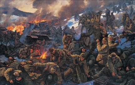 《激戰(zhàn)松骨峰》描繪的是抗美援朝戰(zhàn)爭中,中國人民志愿軍與美軍激烈廝殺的悲壯場面。作者從動(dòng)態(tài)型的構(gòu)圖與形象表層,把戰(zhàn)爭集團(tuán)之間的搏殺以濃重的筆調(diào)展現(xiàn)開來,表現(xiàn)了中國人民志愿軍英勇頑強(qiáng)、熱愛自由和勇于犧牲的精神,展示了歷史的悲劇性沖突。作者從沉甸甸的歷史中找到戰(zhàn)爭中最慘烈、最殘酷、最能表現(xiàn)人物悲劇性命運(yùn)的瞬間,用現(xiàn)實(shí)主義的創(chuàng)作手法,扎實(shí)、生動(dòng)地塑造了一個(gè)又一個(gè)志愿軍勇士的形象。硝煙籠罩著戰(zhàn)場,鮮血與白雪融合成冰,敵我雙方,犬牙交錯(cuò),生死搏殺。同時(shí),也使我們感受到戰(zhàn)爭的殘酷與生命的脆弱。作者處理宏大的戰(zhàn)爭場面獨(dú)具匠心:陽光透過硝煙,有節(jié)奏地營造出戰(zhàn)場的空間;雪地上被間隔的藍(lán)色陰影,反襯出黃褐色的主調(diào)。作品對細(xì)部進(jìn)行了恰如其分的刻畫,但又不失對整體宏觀的把握,厚重的色彩中透出熱情,樸拙的筆觸映著畫家的激動(dòng)。