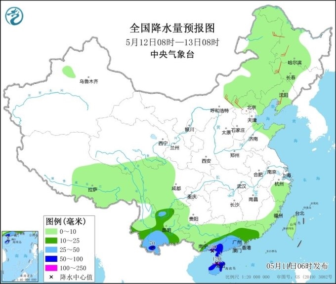 預(yù)計未來三天(11日至13日),華南地區(qū)仍有較強降雨,廣西、廣東、海南島等地大部地區(qū)日雨量有中到大雨,局地暴雨或大暴雨;此外,云南中南部有中到大雨,局地暴雨。
