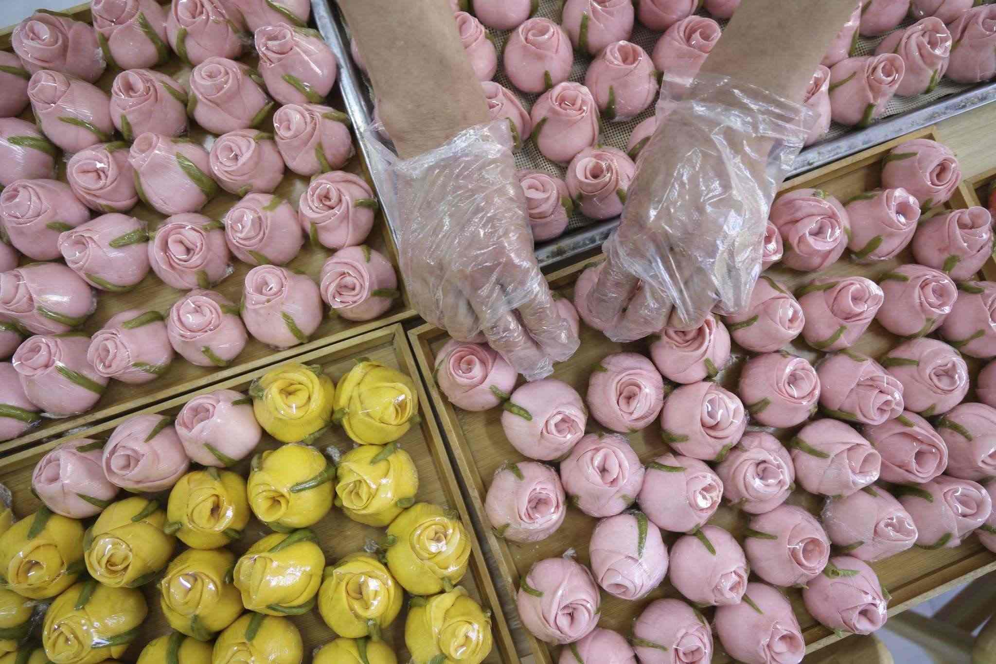 2023年5月12日,山東臨沂,母親節(jié)來臨之際,面點(diǎn)師們制作出色彩鮮艷、軟糯香甜的花饃,受到廣大顧客青睞。視覺中國(guó)
