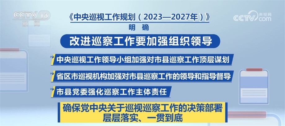 《中央巡視工作規(guī)劃(2023—2027年)》明確,改進巡察工作要加強組織領導。中央巡視工作領導小組加強對市縣巡察工作頂層謀劃,省區(qū)市巡視機構(gòu)加強對市縣巡察工作的領導和指導督導,市縣黨委強化巡察工作主體責任,確保黨中央關于巡視巡察工作的決策部署層層落實、一貫到底。