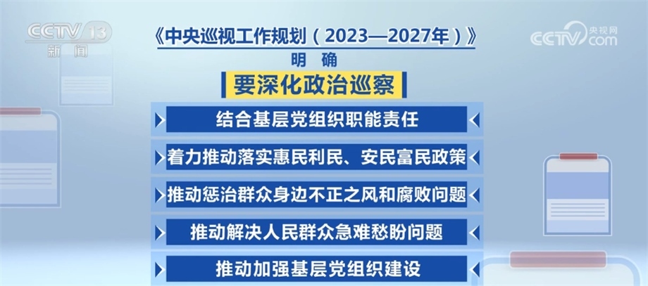 央視網(wǎng)消息:近日,經(jīng)黨中央同意,中共中央辦公廳印發(fā)了《中央巡視工作規(guī)劃(2023—2027年)》,對今后5年的巡視工作作出了部署。一屆任期內(nèi)實現(xiàn)巡視全覆蓋,是黨章規(guī)定的政治任務。通過什么樣的方式實現(xiàn)二十屆中央巡視全覆蓋?采取哪些措施高質(zhì)量推進巡視全覆蓋?在此次印發(fā)的巡視工作規(guī)劃中都作出了要求。