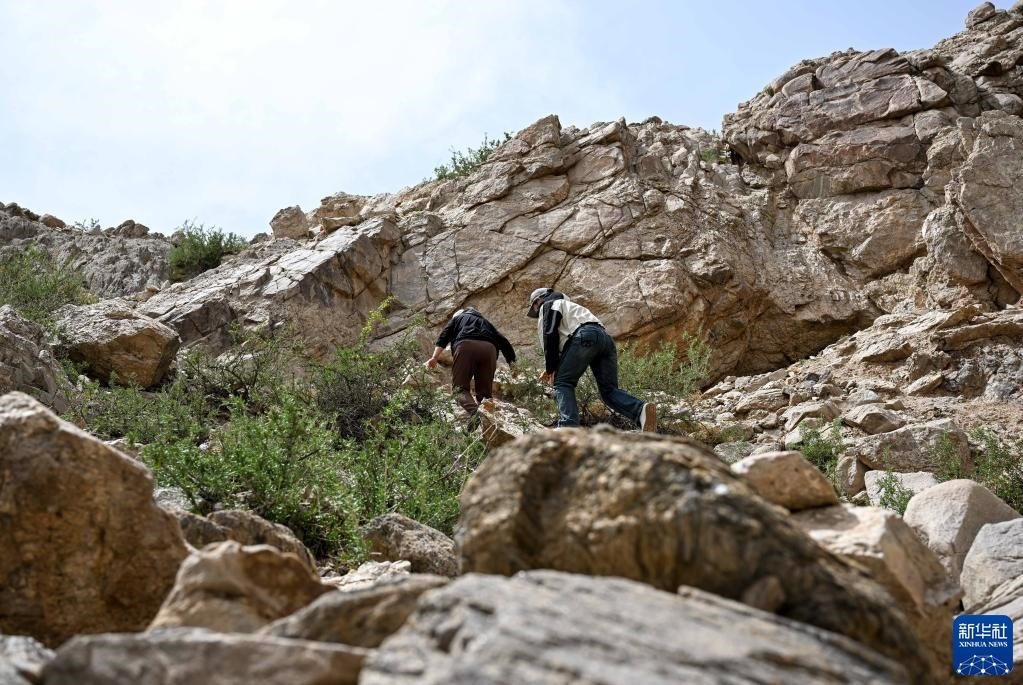 5月13日,駝峰(長城)文物保護隊員許繼龍(右)和烏仁其其格在巡查阿拉善左旗一處石圈遺址。