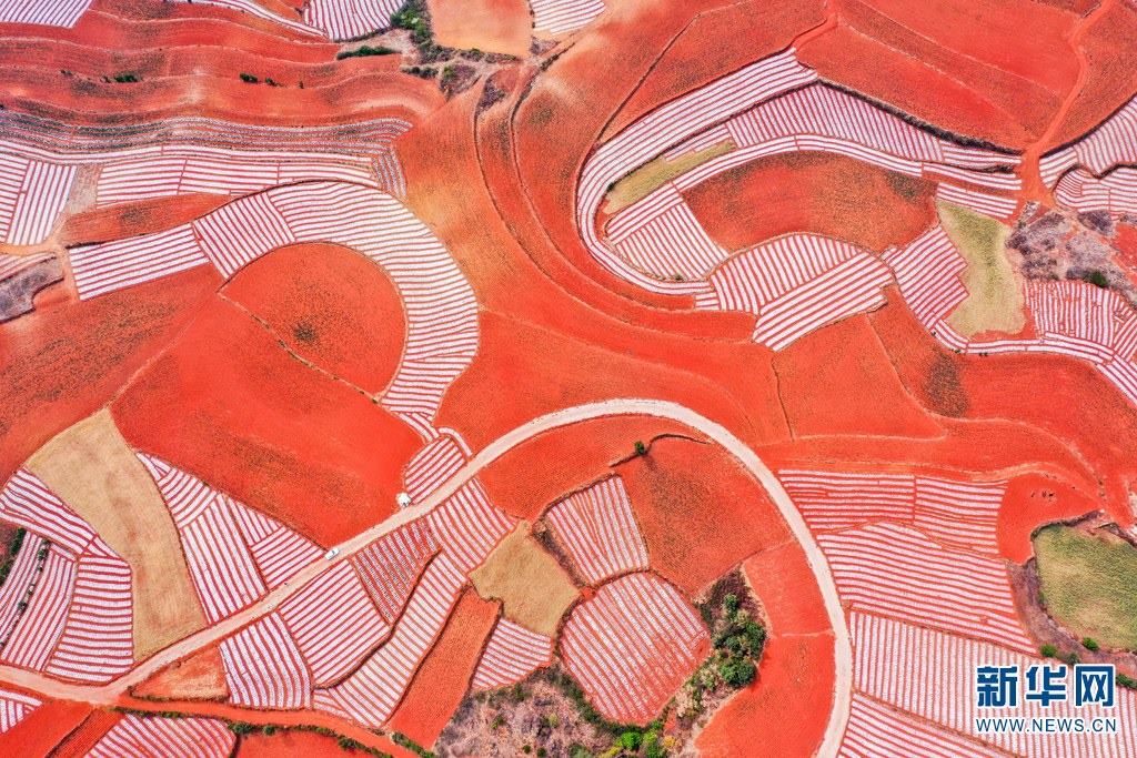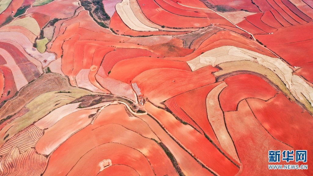 云南省尋甸回族彝族自治縣,連綿不斷的旱梯田遍布山間,遠(yuǎn)接天邊,每年4-5月,經(jīng)過村民翻新、平整后的紅褐色土地,從空中俯瞰五彩斑斕、蔚為壯觀。當(dāng)?shù)卮迕裥燎诟旁诜饰值募t土地上,用勤勞的雙手,繪就一幅幅勞動藝術(shù)畫作。新華網(wǎng)發(fā)(孫文來 攝影報道)