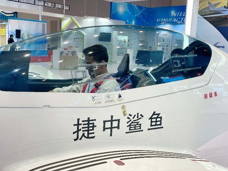 采訪團(tuán)成員在展會(huì)體驗(yàn)“鯊魚飛機(jī)”