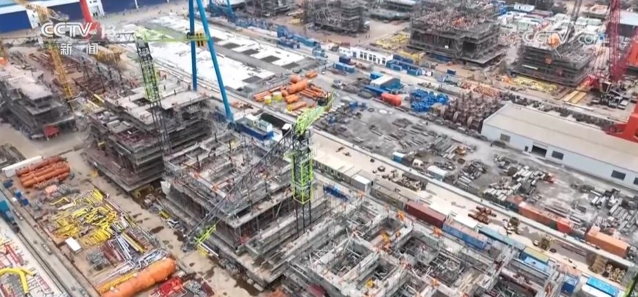這些大家伙,都是世界技術(shù)比較領(lǐng)先的一些海工裝備。通過航拍的鏡頭,給大家展現(xiàn)一下,最遠(yuǎn)的是圓筒形超深水鉆探平臺。因為它的外形是獨特的圓筒型設(shè)計,所以它的抗風(fēng)浪性、作業(yè)水深的能力非常得好,技術(shù)指標(biāo)創(chuàng)下多項世界第一。這家企業(yè),一共向國外交付了6艘同類型的產(chǎn)品。