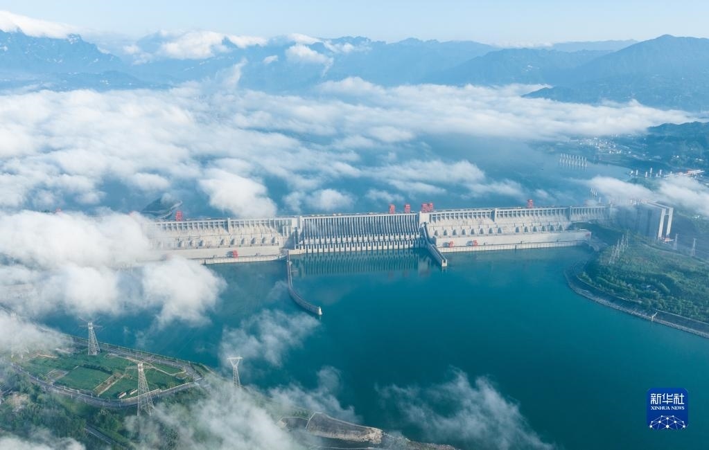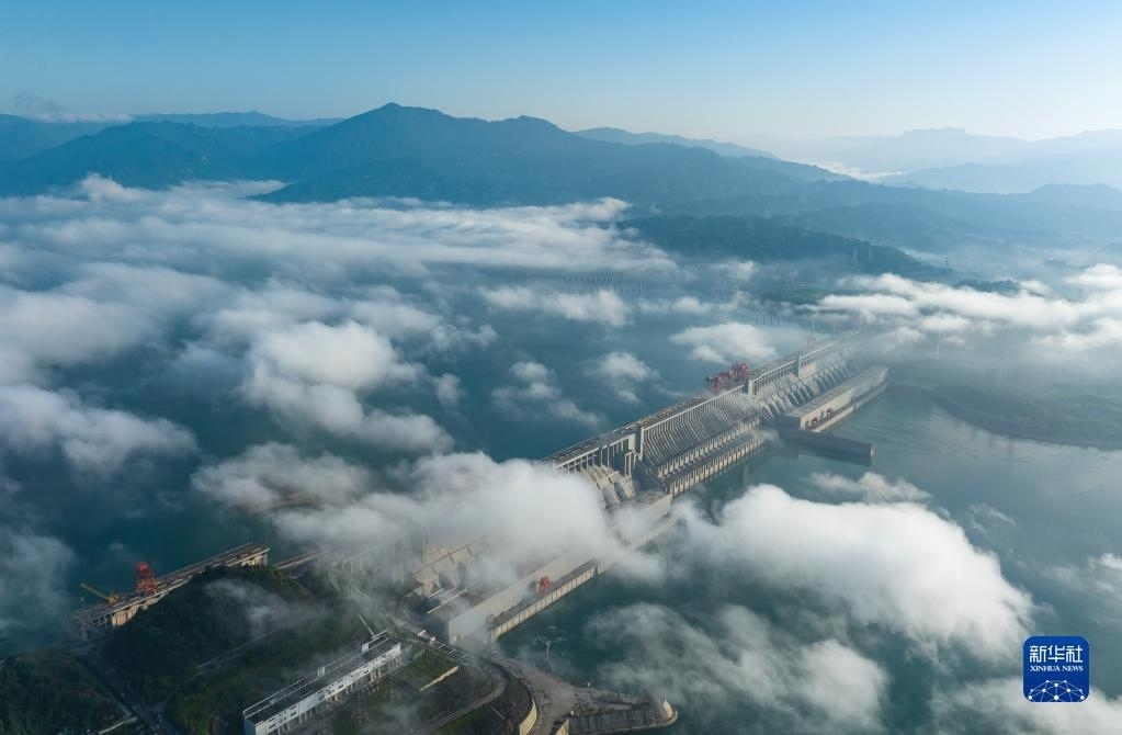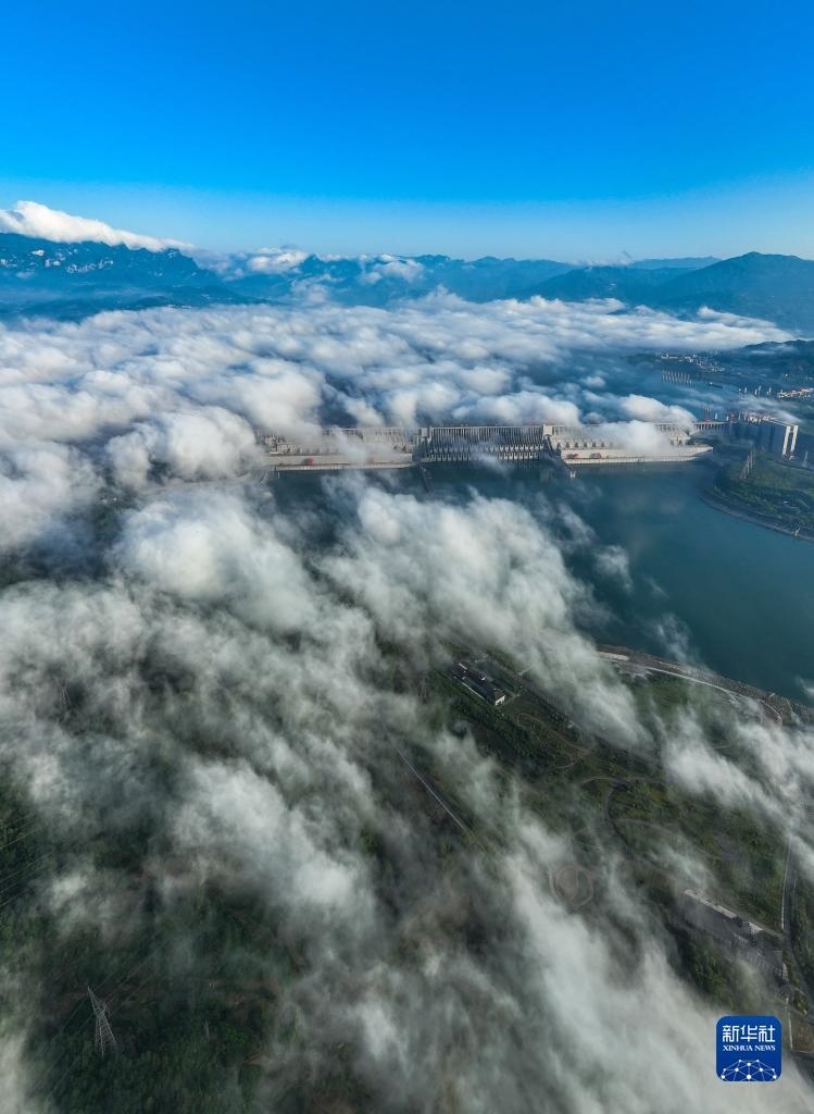 當(dāng)日,湖北宜昌雨過(guò)天晴,三峽上空云霧繚繞,美景如畫(huà)。