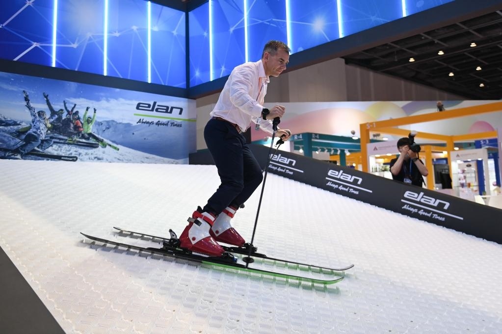 5月16日,來自斯洛文尼亞伊蘭品牌的企業(yè)代表現(xiàn)場展示雪具產(chǎn)品。新華社記者黃宗治 攝