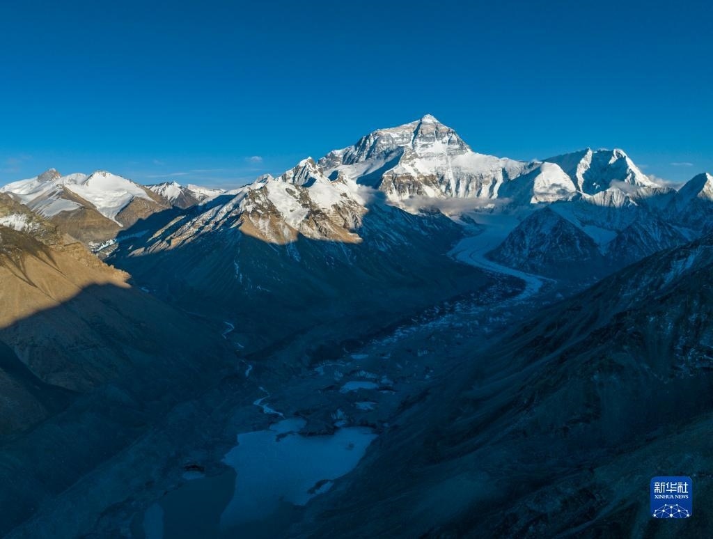 這是日落時(shí)分的珠峰和絨布冰川(5月16日攝,無(wú)人機(jī)照片)。   新華社記者 晉美多吉 攝