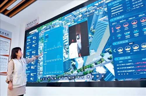 福建省福州市鼓樓區(qū)是國家智能社會治理綜合實驗基地,社區(qū)工作者在鼓樓區(qū)鼓東街道中山社區(qū)介紹“智慧社區(qū)”建設情況(2023年 4 月 25 日攝) 林善傳攝 / 本刊