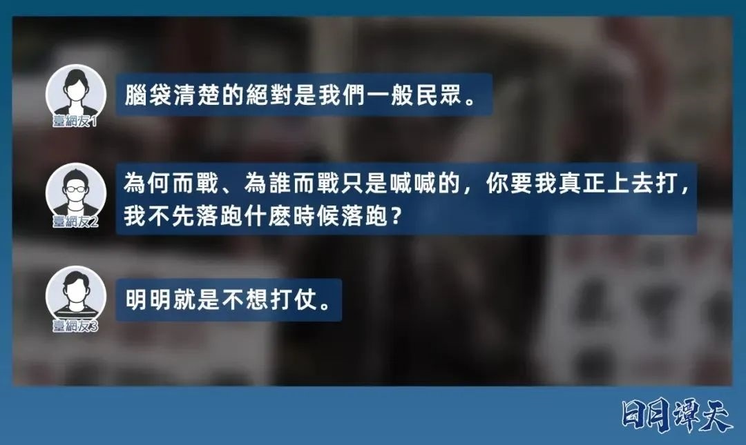 譚主一位來自新北的青年朋友小章說,他服四個月義務兵役時“每天都想要逃離”,服完役才感到解脫,那段時間的心情就是“來不及了快下車”“民進黨就是‘臺獨’啊,我不想去給他們當炮灰”。