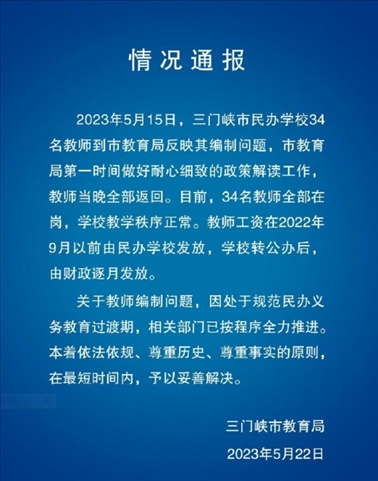 ·三門(mén)峽通報(bào)“34名教師反映編制4年未解決”:目前全部在崗,將妥善解決問(wèn)題。