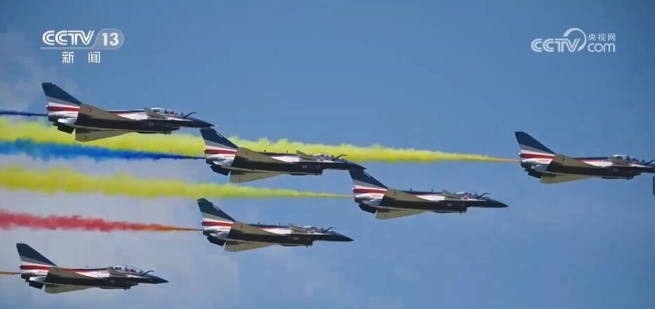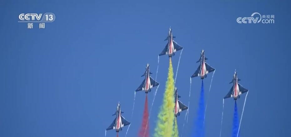 隨著滑出指令下達,噴著五星紅旗涂裝的6架表演機緩緩駛向起飛線。6架表演機在云底高度1000米氣象條件下依次起飛,在空中迅速集結組成箭形編隊。以人字形編隊低空通場,在空中以六道絢麗彩煙,以特殊禮儀向現(xiàn)場致以最崇高的敬意。
