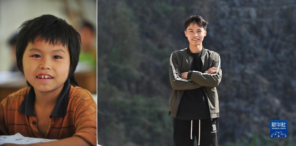拼版照片:左圖為2012年9月3日,在大化瑤族自治縣板升鄉(xiāng)弄勇村,7歲的藍(lán)天德(右一)攀爬“天梯”去學(xué)校;右圖為2023年1月23日,在大化瑤族自治縣板升鄉(xiāng)弄勇村,即將從技校畢業(yè)的藍(lán)天德回家過年。18歲的藍(lán)天德計(jì)劃技校畢業(yè)后繼續(xù)讀大專。 新華社記者 黃孝邦 攝