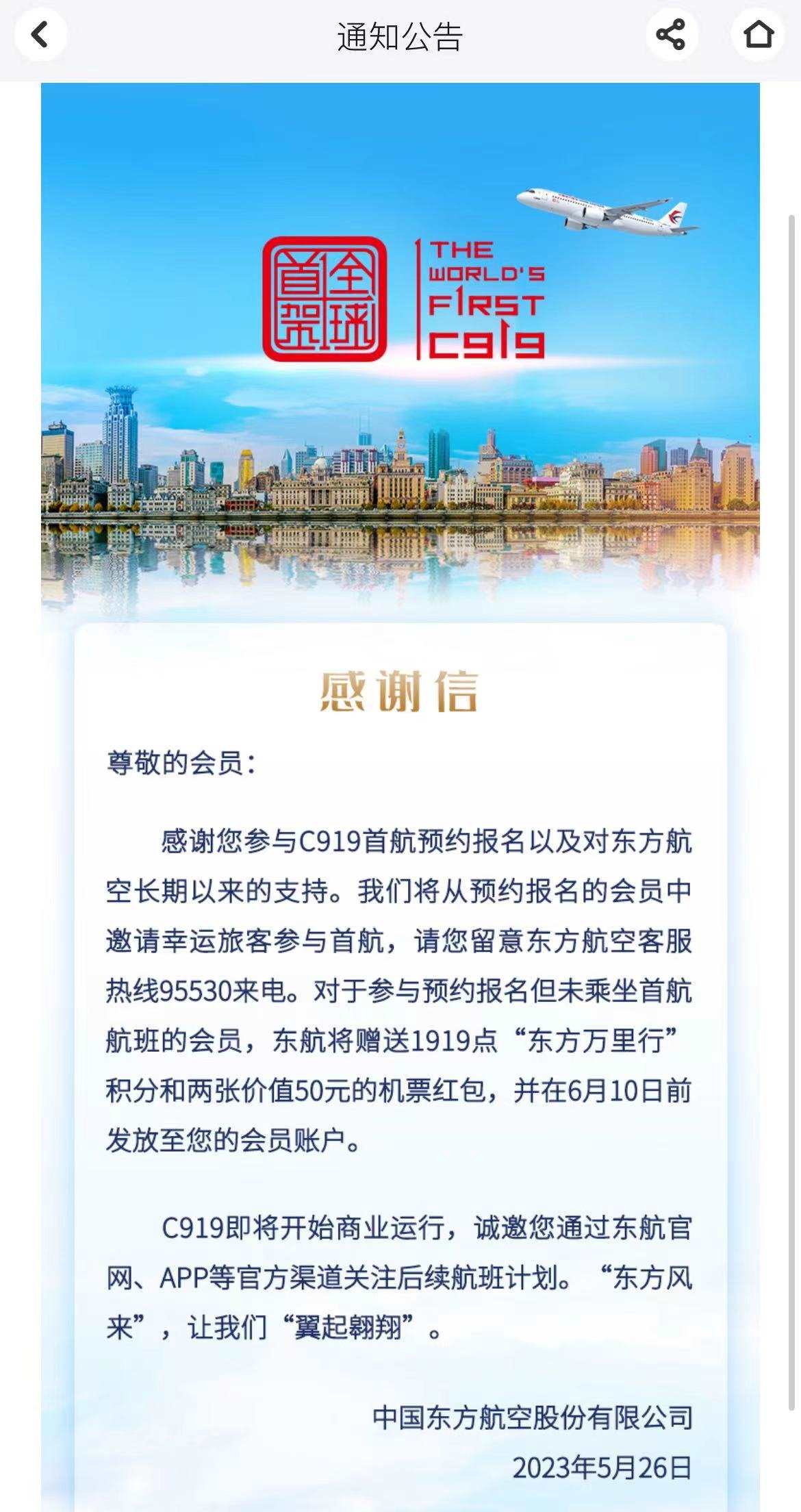 東航APP上還發(fā)布了一則感謝信,信中表示,C919即將開始商業(yè)運(yùn)行,東航將從預(yù)約報(bào)名的會(huì)員中邀請(qǐng)幸運(yùn)旅客參與首航,對(duì)于參與預(yù)約報(bào)名但未乘坐首航航班的會(huì)員,東航將贈(zèng)送1919點(diǎn)“東方萬里行”積分和兩張價(jià)值50元的機(jī)票紅包,并在6月10日前發(fā)放至?xí)T賬戶。