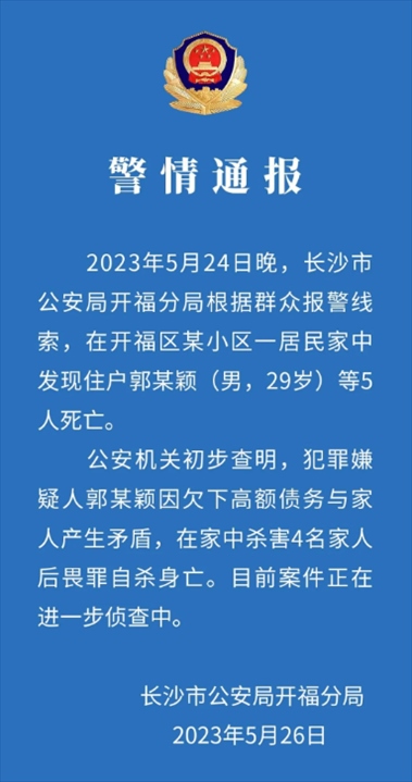 ·警方通報(bào)長沙某小區(qū)房內(nèi)發(fā)現(xiàn)5具尸體:男子殺害4名家人后畏罪自殺。