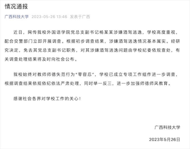 ·廣西科大通報(bào)學(xué)院副書記涉酒駕逃逸:免職,學(xué)校紀(jì)委介入。