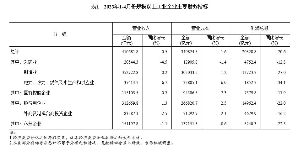1—4月份,規(guī)模以上工業(yè)企業(yè)中,國有控股企業(yè)實現(xiàn)利潤總額7579.8億元,同比下降17.9%;股份制企業(yè)實現(xiàn)利潤總額14962.4億元,下降22.0%;外商及港澳臺商投資企業(yè)實現(xiàn)利潤總額4679.9億元,下降16.2%;私營企業(yè)實現(xiàn)利潤總額5240.3億元,下降22.5%。