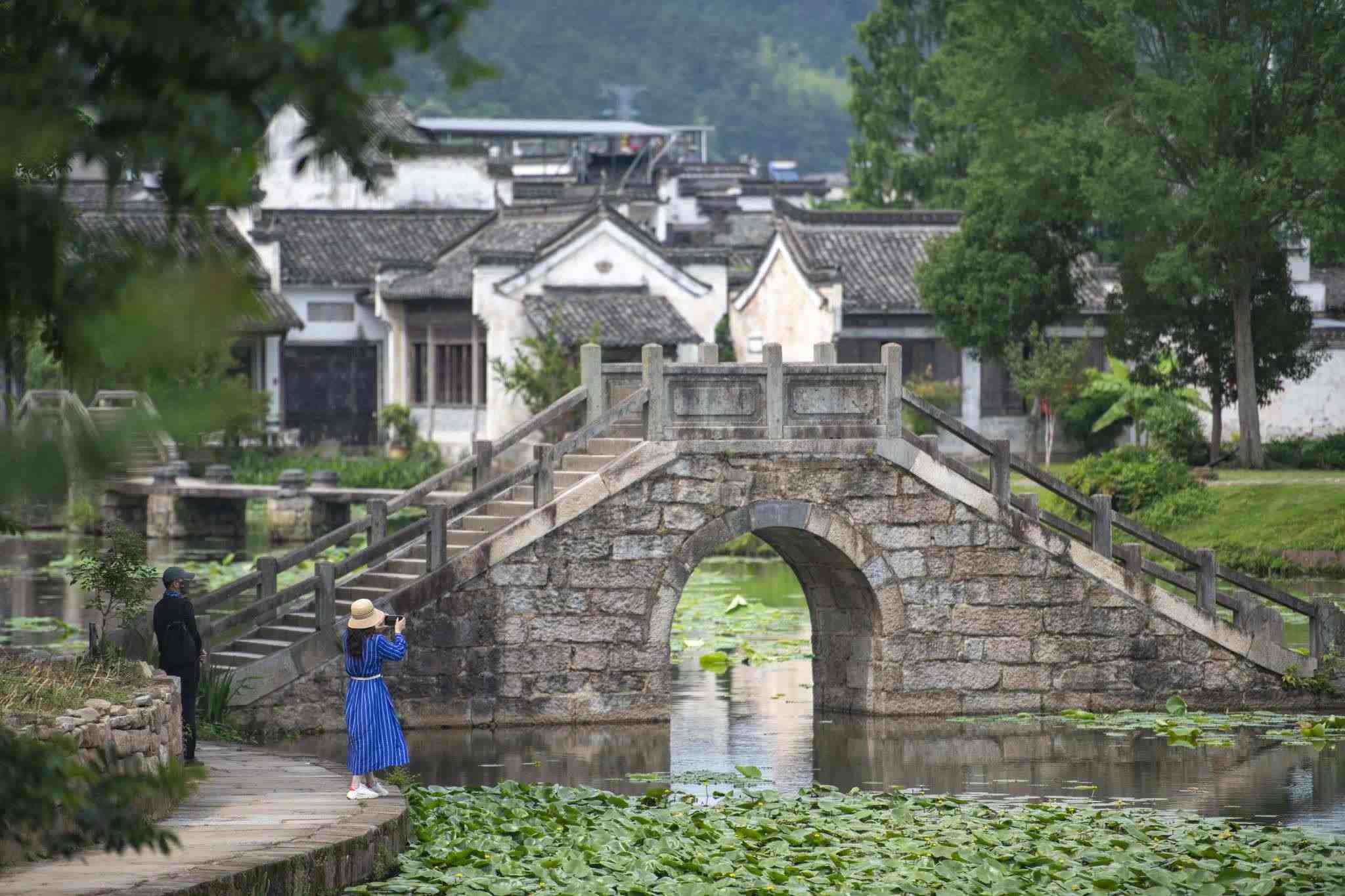 2023年5月26日,安徽黃山,徽州區(qū)呈坎村綠樹成蔭碧水蕩漾。視覺中國