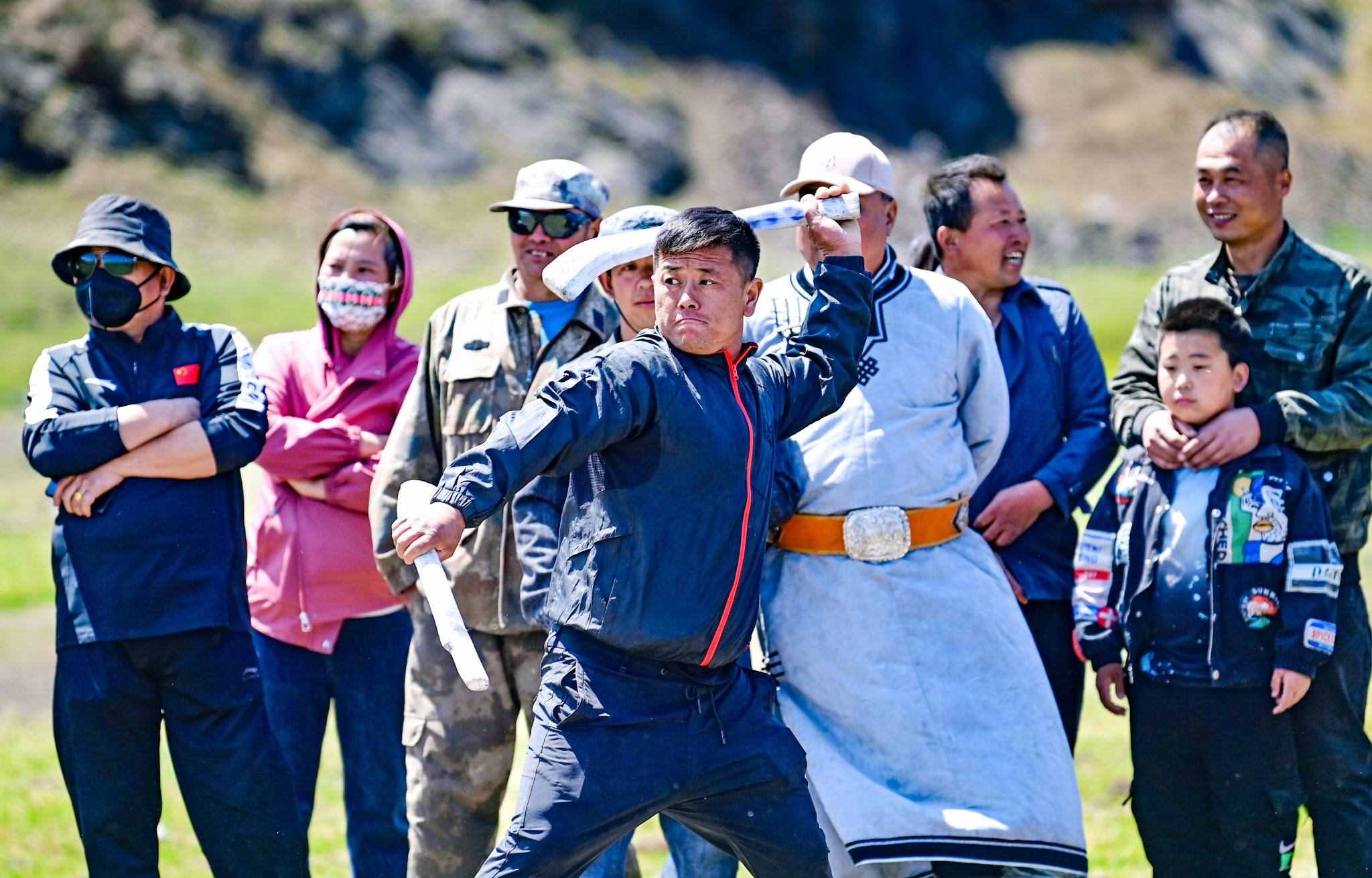 2023年5月26日,內(nèi)蒙古興安盟,科爾沁右翼前旗德伯斯鎮(zhèn)阿日林一合嘎查舉行首屆那達(dá)慕,設(shè)置的賽馬、布魯、搏克、拔河等傳統(tǒng)體育娛樂項(xiàng)目,吸引嘎查周邊500余名牧民參加比賽,喜慶牧業(yè)豐收季。視覺中國