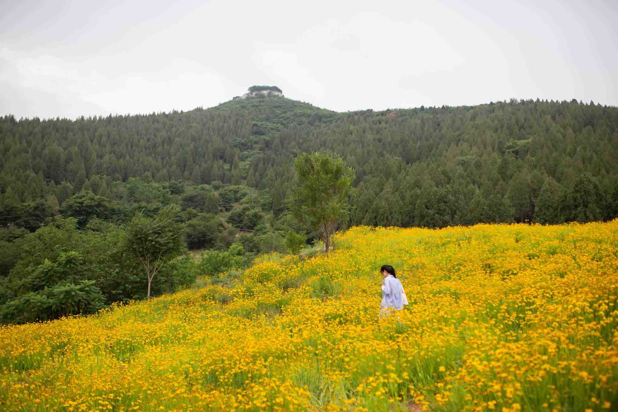 2023年5月26日,濟南蚰蜒山,山谷大片的金雞菊盛開,宛如一片黃色的花海。視覺中國